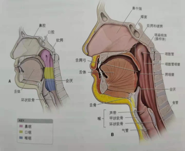 解析:会厌是区分口咽与喉咽的解剖边界,如图3-1.咽分为3个部分:鼻咽、口咽、喉咽。咽充当了呼吸道消化道的共同通道,鼻咽位于软腭以上,蝶骨以下,鼻腔的后面。口咽位于软腭和会厌之间,口腔的后部。喉咽位于会厌和环状软骨之间,喉的后部。