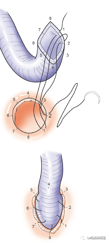 在静脉移植物长度有限或升主动脉上存在多个吻合的情况下,可以使用单个静脉移植物构建两个或多个远端触地部位(图1.13a-e)。在减压的停搏心脏中,可能难以评估静脉移植物与动脉的最佳空间关系。应避免末端静脉段到远端冠状动脉吻合部位和侧对侧静脉移植冠状动脉吻合部位之间的张力或过长,这为单个静脉移植创造了第二或第三个触地点。通常首先创建远端端侧吻合。更近端侧对侧吻合的最简单方向是使静脉平行于动脉。从足跟开始吻合,远侧壁完全打开。然后降落伞降落,前墙就完成了。其他人更喜欢垂直顺序侧对侧吻合技术。必须注意不要使动脉切开术或静脉移植切开术过长,否则会发生鸥翼畸形。
