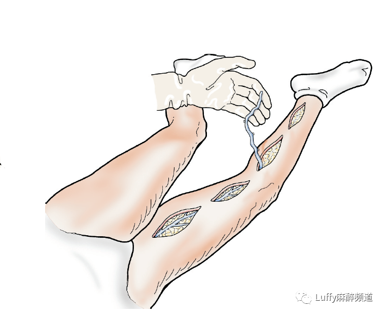 两个下肢都在圆周上准备好并覆盖到田间以采集大隐静脉。许多人发现术前使用超声来评估隐静脉的大小并标记其位置很有用。腿被放置在青蛙腿位置以暴露静脉。助手通常在移动 IMA 蒂的同时采集大隐静脉。重要的是向助手传达要使用的静脉旁路的预期数量。一个好的经验法则是,足够长的静脉从拇指尖延伸到小指尖,手指伸展。大隐静脉沿着大腿内侧和小腿以足够恒定的模式走行,一旦在远端或近端识别静脉,就可以进行跳跃切口,以避免在下肢的整个长度上留下长而变形的疤痕(图 1.5)。如果使用多个切口和隧道,重要的是要避免对静脉的牵引损伤。放置在静脉周围的血管环可用于小心牵引。应该冲洗和冲洗静脉,以免它变干并损伤内皮。