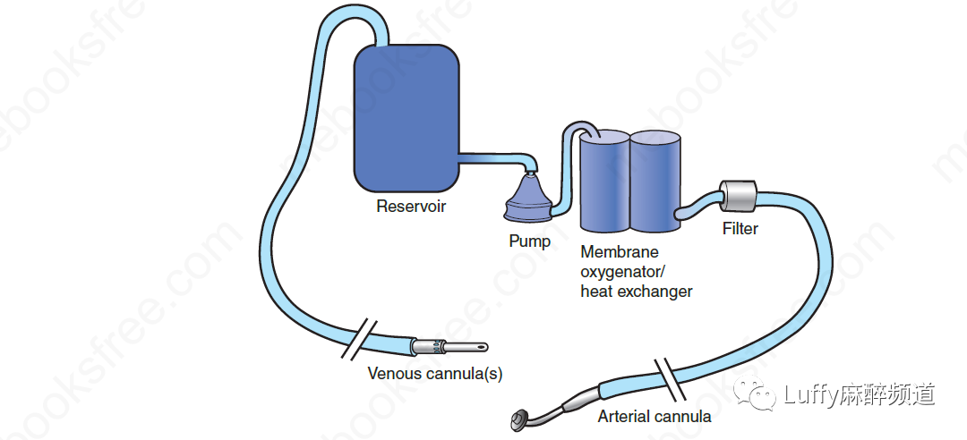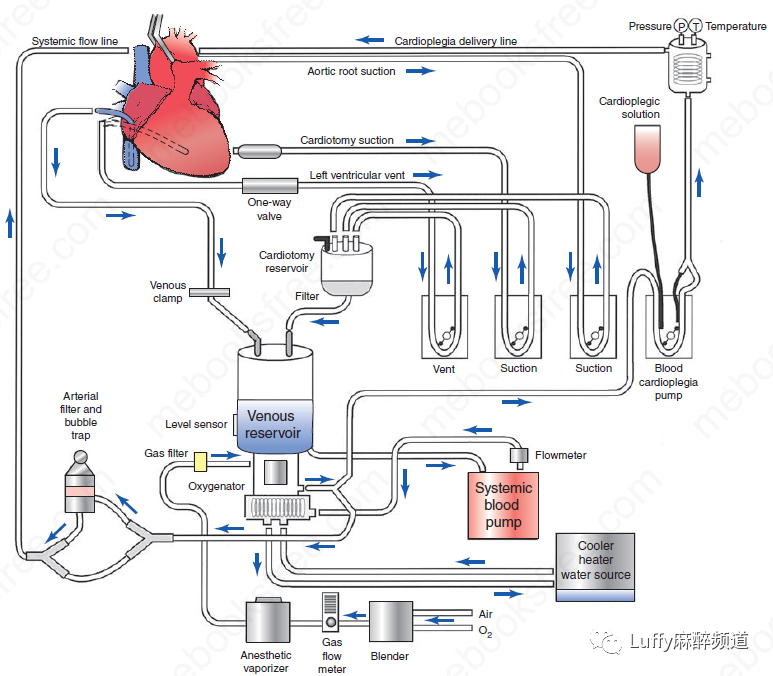 图 2 典型的体外循环回路示意图,包括排气口、现场抽吸、主动脉根部抽吸和心脏停搏系统。血液从单个“两级”导管排入静脉储存器,该储存器是膜式氧合器/热交换器装置的一部分。静脉血从装置中流出,然后通过热交换器和氧合器泵送。动脉化血液离开氧合器,通过过滤器/气泡收集器进入主动脉插管,该插管通常位于升主动脉内。从通风口和抽吸系统吸入的血液在进入静脉储存器之前进入一个单独的心脏切开储存器,该储存器包含一个微过滤器。心脏停搏系统由添加心脏停搏液的动脉线的一根刺供给,并通过一个单独的热交换器泵入顺行或逆行导管。换热器的氧合器气体和水由独立来源供应。