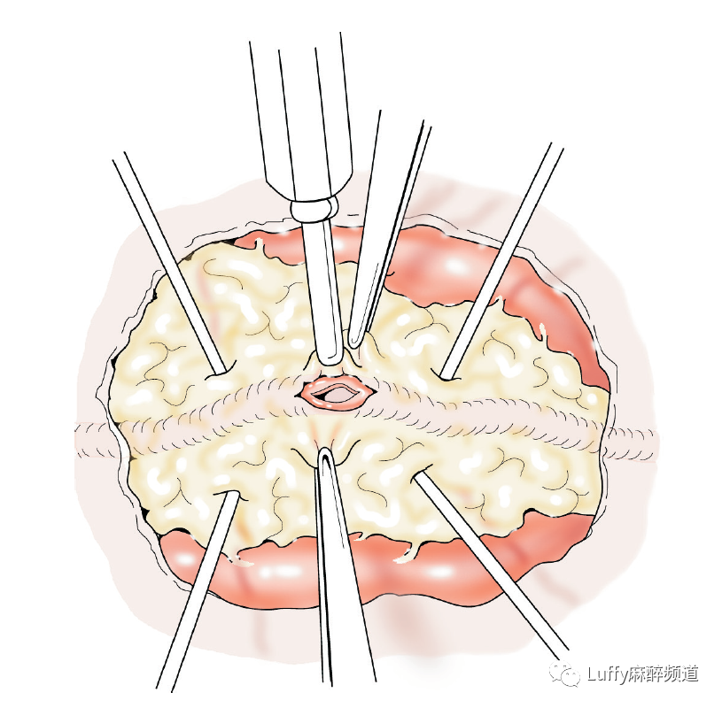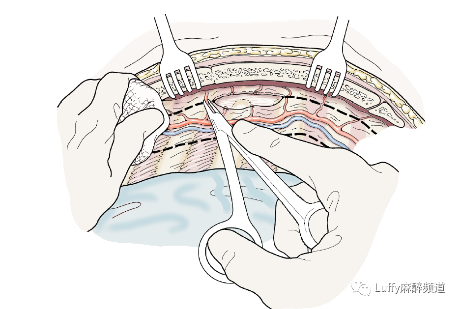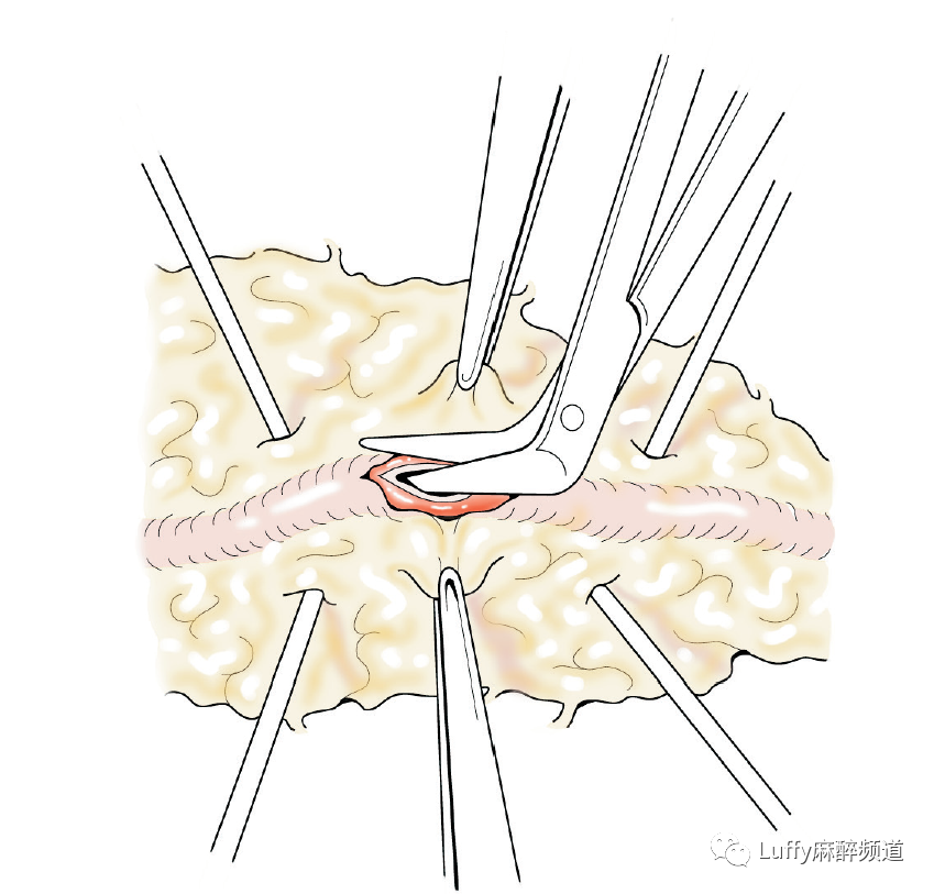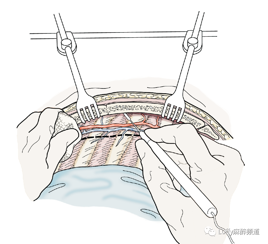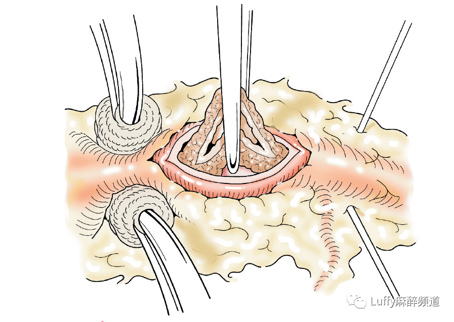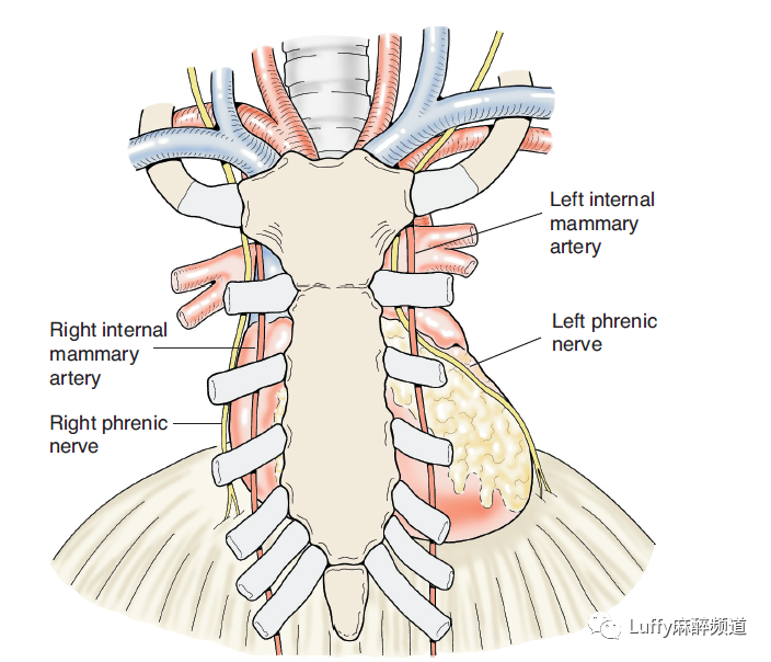 切口切口从胸骨切迹和胸骨角的中点向下到剑突的尖端(图1.1)。胸骨切迹的回缩允许仔细分割锁骨-锁骨韧带。仔细注意无名动脉的位置,它通常在此之上和深。当手指小心地进入胸骨台下时,解剖停止。胸骨锯应从顶部插入,锯护罩面向患者颈部,锯片位于尾部。胸骨分离和回缩后,有时需要将切口向头部延伸,以避免在胸骨完全回缩时对中线皮肤和皮下组织造成过度紧张。胸骨的边缘被仔细烧灼以止血。少量的骨蜡用于止血。胸腺组织、皮下组织和任何肌肉都被划分到头臂静脉的下缘。
