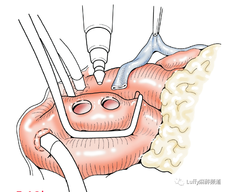 助手用两个细镊子将静脉的远端保持打开,从脚趾或脚跟开始连续吻合。通过静脉和冠状动脉放置四或五次缝合线,然后将静脉降低到位并完成吻合(图1.8d 和 e)。可以使用细神经钩将连续缝合线贴紧以避免泄漏。可以在缝合线完成之前放置一个小探针 (1.5 mm) 以评估吻合的脚趾。静脉移植物充满 50 mL 冷血心脏停搏液,以评估吻合口漏以及心肌保护。然后可以用软颚斗牛犬钳在远端闭塞静脉移植物,填充肝素盐水,并适当调整大小以进行无张力移植。在确定静脉移植物的尺寸时,我们通常通过部分闭塞静脉回流线来填充心脏。此时可完成近端静脉移植吻合,也可留作最后。在重新定位心脏以获取额外的下壁或侧壁目标时,可以给予额外的顺行或逆行心脏停搏液。对于侧壁移植物,在心脏后面放置一个冷垫,将左心室的心尖轻轻地向右缩回,暴露侧壁的血管。准确的定位取决于为远端吻合选择的部位,并且使用轻柔的手动牵引或硅胶带,钝缘或其他侧动脉分支的部分被稳定和切开。以与上述类似的脚跟到脚趾方式完成吻合。