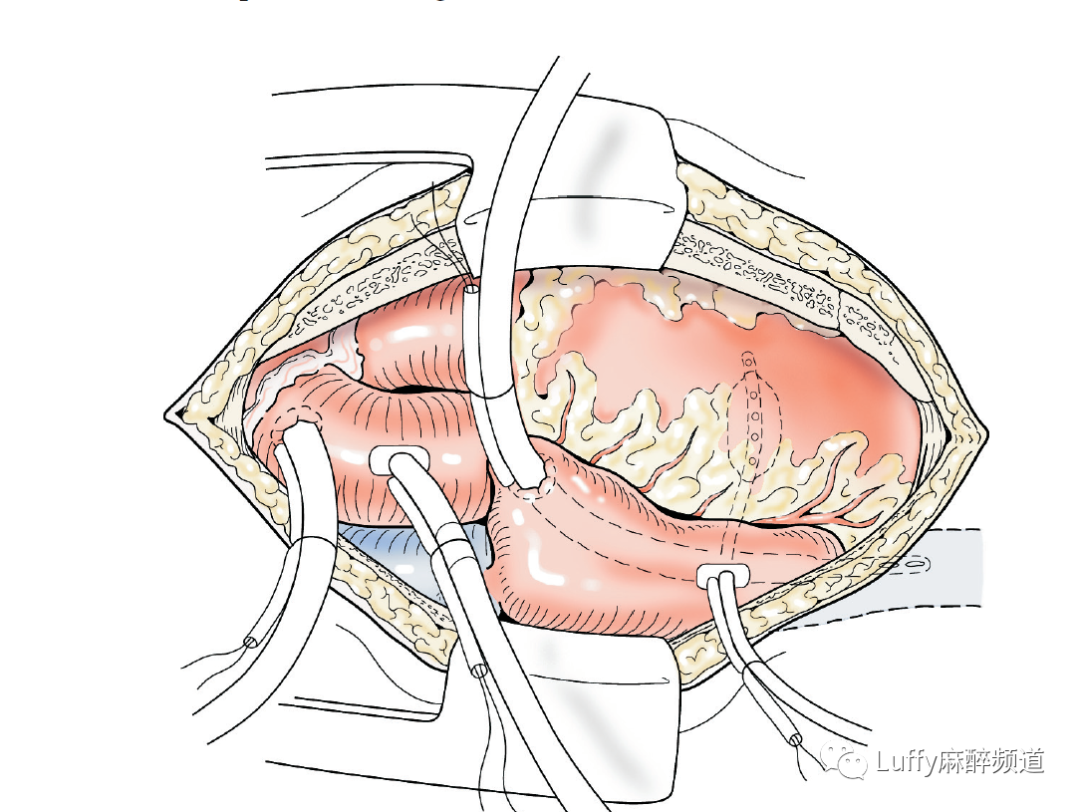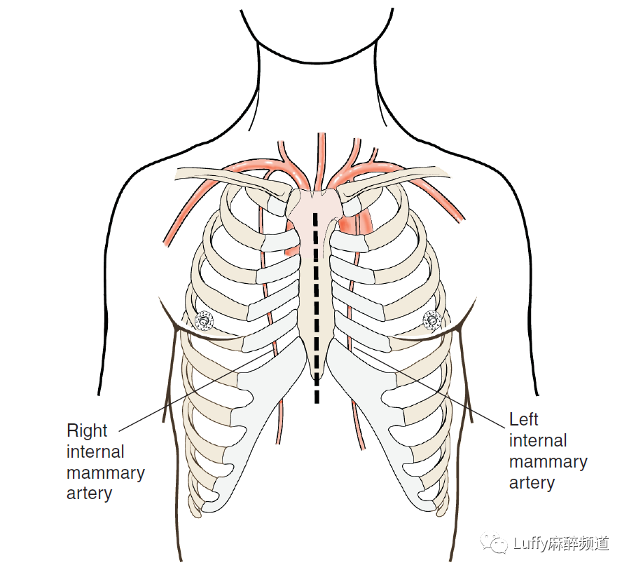乳腺动脉起源于靠近甲状腺颈干和锁骨胸骨端下方的左锁骨下动脉(图1.2)。它在胸骨和肋骨软骨的外侧从锁骨向下延伸到肋软骨交界处的前胸壁内侧。IMA 分支形成肋间动脉,在第五或第六间隙,乳腺动脉分为肌膈支和上腹支。IMA 伴随着两条带有支流的静脉肋间血管蒂和邻近的胸壁。这些静脉从锁骨下动脉进入乳腺动脉起点正下方的左锁骨下静脉。膈神经进入靠近 IMA 起点的胸腔并穿过锁骨下静脉。这条神经可能会被 IMA 起源附近的电灼伤。在肝素化之前,放置乳房牵开器以抬起左半侧。近端刀片放置在柄下,远端刀片放置在剑突上方(图1.3)。半身是慢慢的升高,桌子向左旋转以改善可视化。我们喜欢此时打开左侧胸膜腔。这允许带蒂的 IMA 移植物远离中线。使用烧灼器和金属夹分离包含 IMA 和伴随静脉的 1 厘米宽的椎弓根。抬高左胸壁,在可见或触诊到的乳腺动脉的内侧和外侧的胸内筋膜中进行平行切口。我们从近端开始解剖平面,在第三肋骨的水平。一旦蒂的第一部分,包括动脉和静脉,从胸壁轻轻分离,放置在蒂上的牵引允许静脉和动脉侧支的可视化(图1.4)。注意不要抓住乳腺动脉。使用闭合钳向下回缩是有用的。动脉侧的侧支用小血管夹夹住, 胸壁侧在低功率下小心烧灼。将椎弓根向近端移动至锁骨下静脉水平,向远端移动足够长的 IMA 分叉。我们仔细检查 IMA 蒂的胸壁和床是否止血。患者此时被肝素化,在 IMA 分叉处放置大夹子后,将远端椎弓根分开。此时会评估 IMA 中的流量。将软颚斗牛犬牵开器放置在 IMA 椎弓根的远端,并在椎弓根上注射罂粟碱。蒂被小心地放置在左胸腔内,避免扭曲。一些外科医生在切开端用夹子封堵带蒂移植物,使血流在整个乳腺动脉中流动,以避免远端动脉血管痉挛,并有望扩张动脉。
