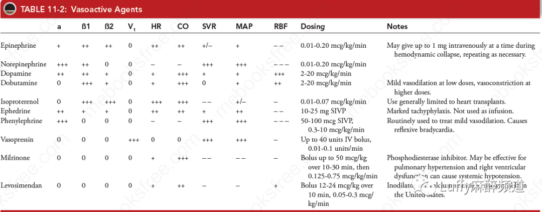 数据来自 Stoelting RK,Hillier SC:麻醉实践中的药理学和生理学,第 4 版。Philadelphia, Lippincott Williams and Wilkins; 2005 and Overgaard CB, Dzavîk V:正性肌力药和辅助加压药:心血管疾病的生理学和临床使用回顾,循环 2008 年 9 月 2 日;118(10):1047-1056。心率(HR)、心输出量(CO)、全身血管阻力(SVR)、平均动脉压(MAP)、肾血流量(RBF)。无效果(0),最小增加(+),适度增加(++),显著增加(+++),最小减少(-),适度减少(- -),显著减少(- - -)。