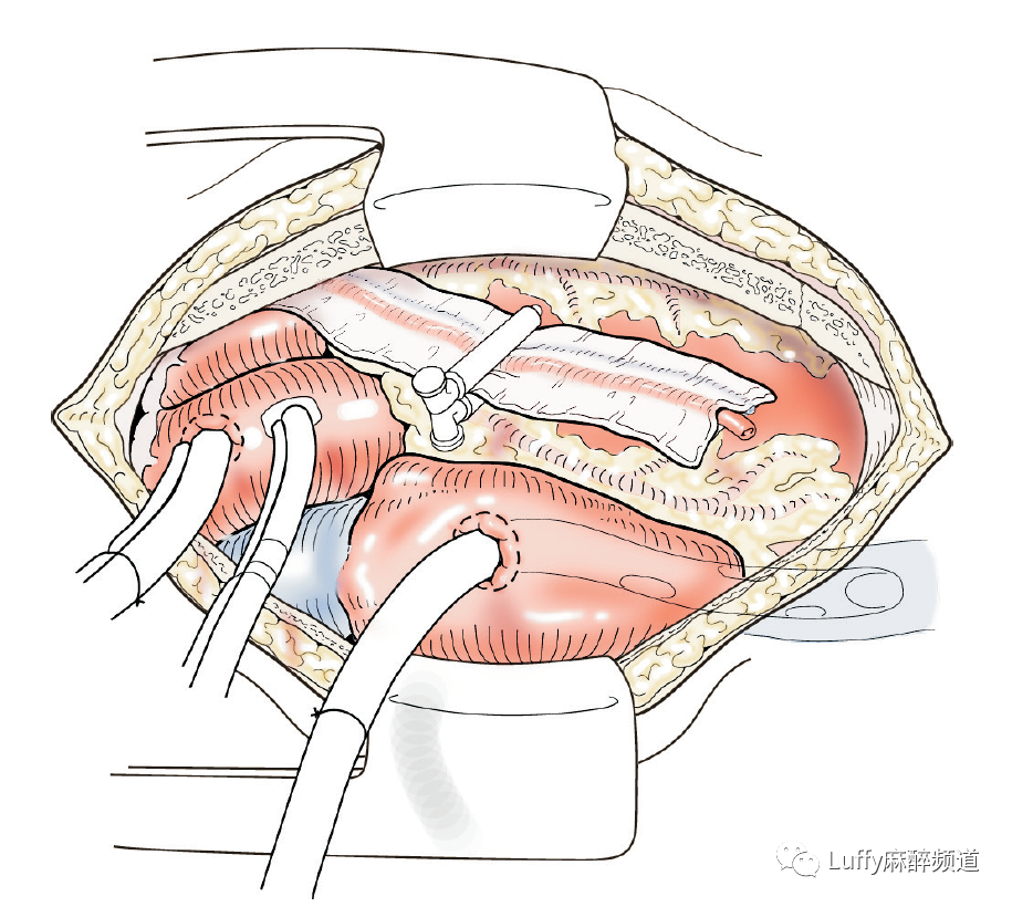 在准备体外循环 (CPB) 时(图 1.7),心包牵引缝合线被放置在双侧以抬高和暴露心脏。在心包的外表面上可以看到膈神经,并制作一个 T 形切口或窗口,使 IMA 蒂在没有张力的情况下通过。仔细触诊升主动脉是否有钙、斑块或壁增厚。两根荷包缝合线放置在无名动脉水平的近端主动脉弓中。如果通过 TEE 或手动触诊担心升主动脉中的斑块,可以使用主动脉超声找到可接受的插管位置。在这种情况下,很少必须使用无名动脉或腋动脉进行动脉插管。单静脉插管是通过右心耳用双级插管进行的,其尖端放置在下腔静脉中。在这一点上考虑十字夹的放置并为心脏停搏液套管和近端移植部位留出足够的空间是很重要的。一个组合的顺行停搏液/根通气管被放置在升主动脉中间。对于左心室功能代偿良好且没有主动脉瓣关闭不全证据的患者,通常不会放置逆行冠状窦导管,但可以轻松添加。温度监测探头可以插入隔垫,在 LAD 的右侧。