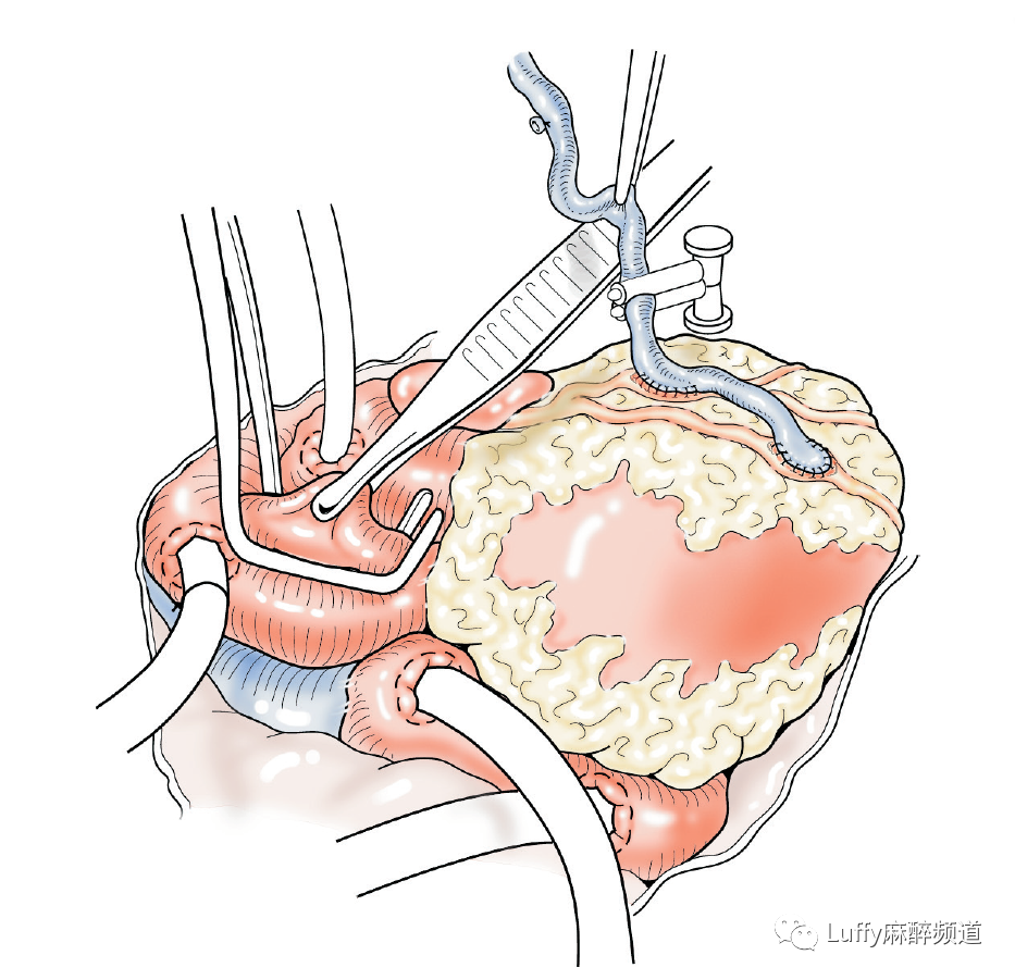 完成所有静脉移植吻合后,泵流量减少,主动脉交叉夹或侧咬主动脉夹被移除。接下来,应在远端闭塞的静脉移植物通过细针穿刺脱气,以避免夹带空气。然后在远端冠状动脉中建立血流。主动脉根部通风口开始排气。我们通常会在此时放置动脉和静脉导线用于起搏。在适当的再灌注和恢复正常、稳定的心律后,停止 CPB。静脉插管被移除并在需要返回旁路的情况下圈套下来。根部通气管和逆行心脏停搏液或 LV 通气管被移除并缝合这些部位。直角 32 Fr 胸管放置在心脏后方和位于横膈膜上方的左侧胸膜腔中。心脏后方的成角度管的角度与任何下层移植部位无关。然后移除主动脉插管并缝合该部位。在闭合前,将一根 28 Fr 的直胸管放置在左胸膜尖部和前纵隔中。