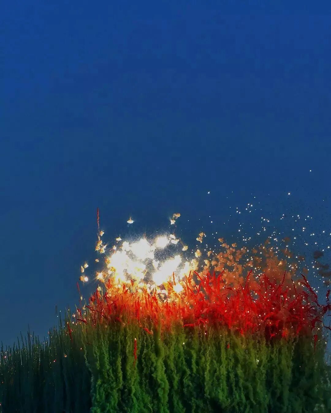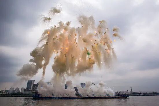 后来,为了彰显艺术的真实,他完全脱离颜料,只用火药,并将学到的灾难美学融进自己的烟花爆破中。