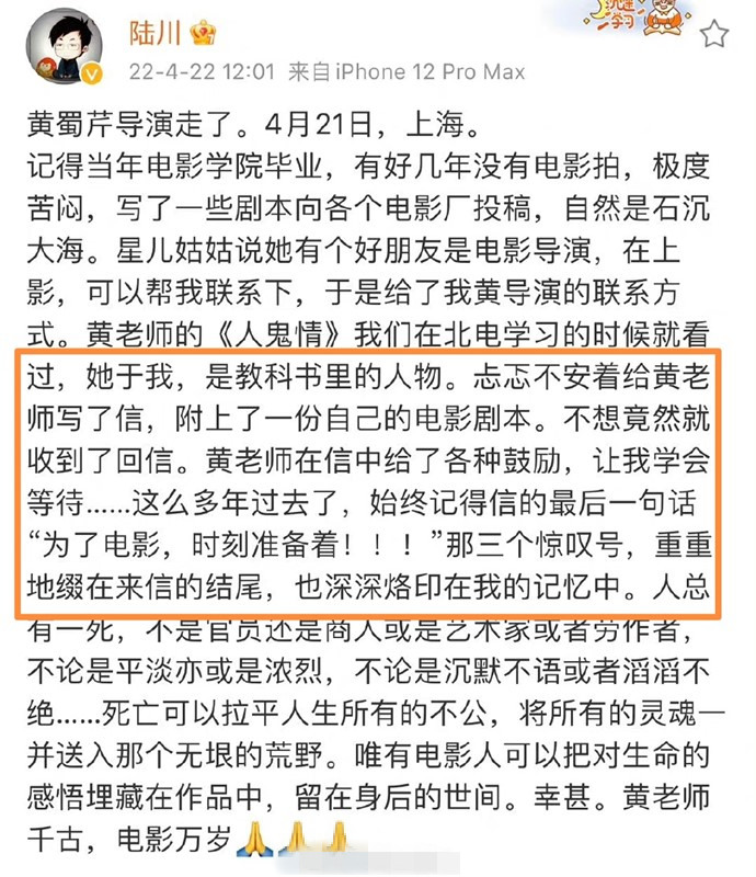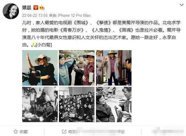 黄蜀芹导演去世后,大半个演艺圈震荡,姚晨、胡兵、薛佳凝等人,都为她发文悼念。