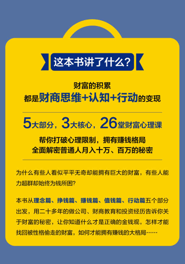 这本书,不是让你辛苦加班或教你几招挣钱方式,而是让你打破穷人思维,实现从挣钱、赚钱到值钱的飞速跨越,帮你打破心理限制,拥有赚钱格局,把属于自己的钱,一点一点拿回来!