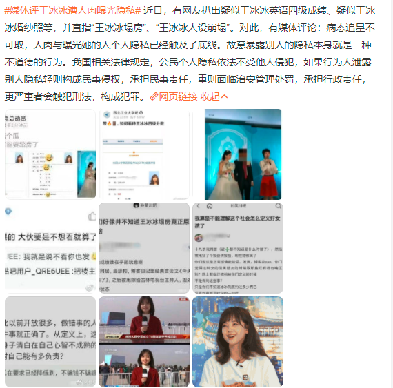 简单回溯,就是一直被网友“宠爱”、在B站上粉丝百万的央视记者王冰冰,因为被“人肉”出大学英语四级考了两次,才300多分;19岁时就谈恋爱,写“露骨”恋爱博客;现在已32岁,已经结婚并离过婚;觉得被“欺骗”了的网友将其推向了网暴的旋涡。