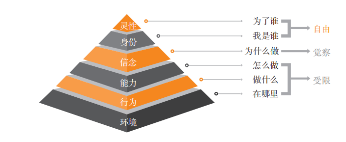简单来说,就是他发现人类的思考有6个层次,分别是环境、行为、能力、信念、身份和灵性。