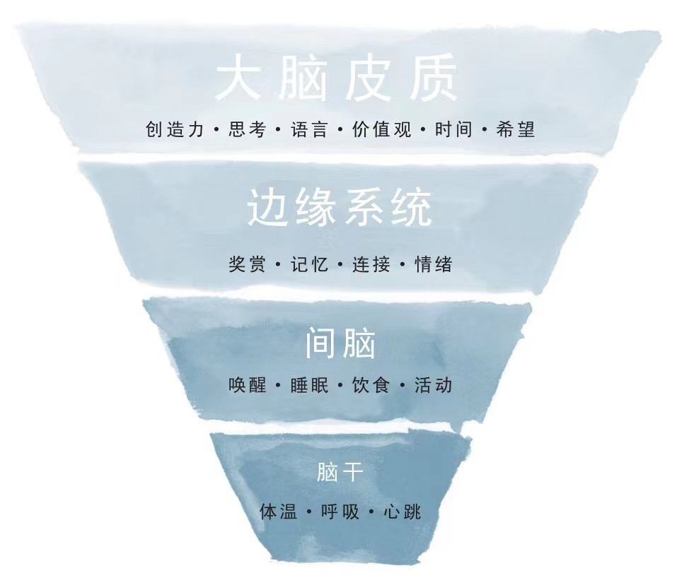 最上面一层是我们的大脑皮质层,它的功能部分是意识所能触达的。比如:时间、语言、思考、做计划、逻辑、创造力、希望等抽象认知。我们的信仰和价值观都储存在这里。