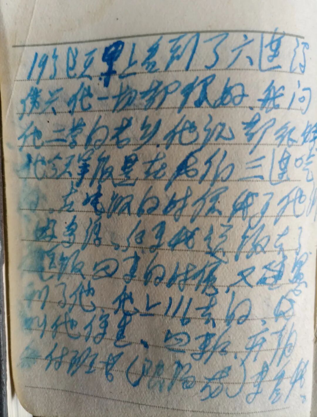 (王建龙战时日记,此页记载了他19日与冯伟兴战地重逢和在送饭返回路上遇见前往116号阵地送饭的冯伟兴)
