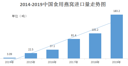 燕窝进口产业也越吃越大。据中国报告网,2014年-2018年我国燕窝进口量翻涨50倍。全球燕窝市场80%都被中国人吃掉了。