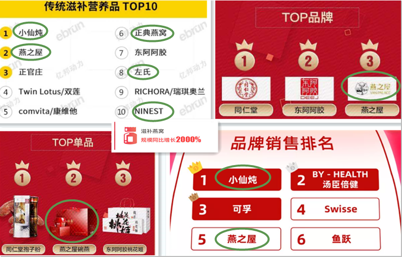 天猫双十一传统滋补品预售榜Top10,燕窝品牌占一半;苏宁双十一燕窝同比增长2000%;京东近5年的燕窝销售额足足涨了30倍。
