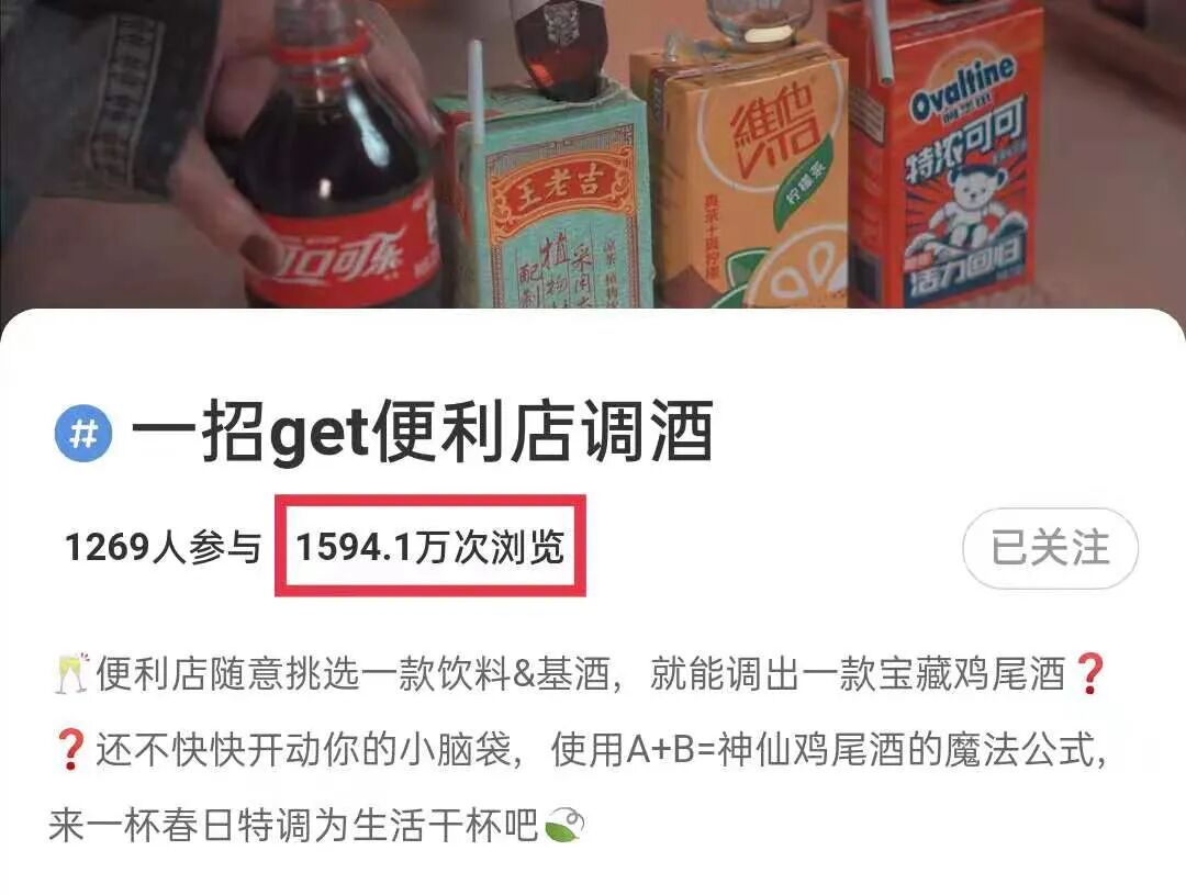 便利店调酒,从小红书火遍了全网各个社交平台,单在小红书上,话题#一招get便利店调酒就有近1600万次的浏览量。