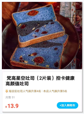 “奈雪的茶”卖的欧包各种粉嫩,“怪兽不厌食”做兽角弯弯的形状,“糖涩”出了彩虹星空流沙,怪兽不厌食甚至玩出艺术,直接在面包片上复刻梵高星空……就差把“好看就发朋友圈”几个字印上了。