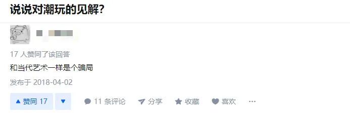 有人在知乎上请大家说说对潮玩的见解。有人一针见血地回复,潮玩是一场和当代艺术一样的骗局。