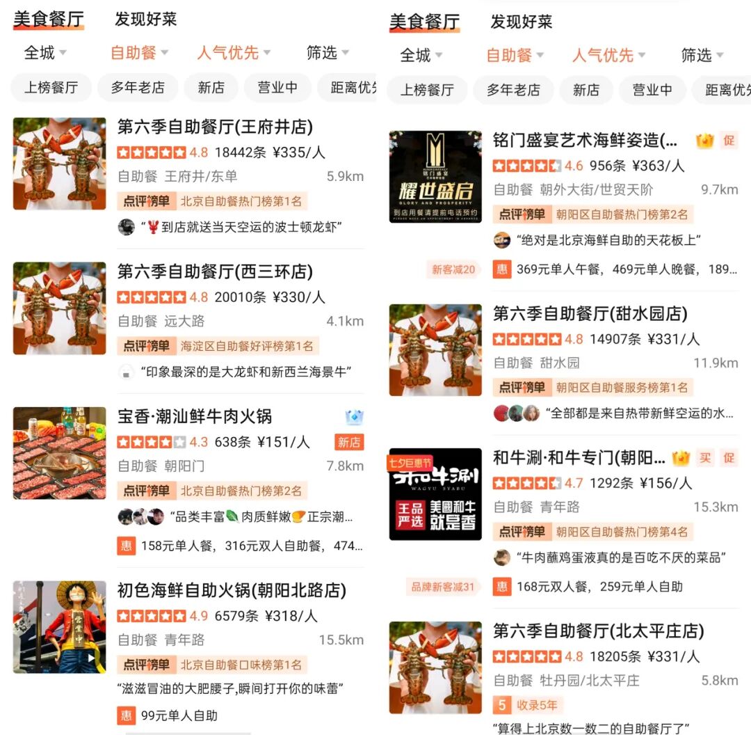 打开大众点评,不难发现主打海鲜自助的第六季餐厅有着接近满分的评分和动辄一两万条的评论,人气口碑俱佳。
