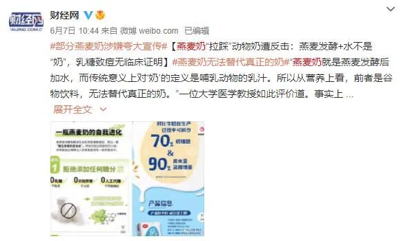 今年主流媒体财经网也发微博提到了“燕麦奶拉踩动物奶”的相关事件,支持牛奶成为了评论区里最主流的声音。