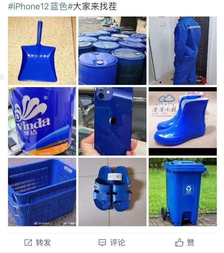 在iPhone12刚发布时,其克莱因蓝配色就引发群嘲,“垃圾桶” “购物筐” “拖鞋” “抹布”……以至于买了最新款手机都不敢发朋友圈。