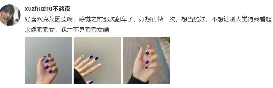 在克莱因蓝的评论区,很多女孩表示,“想当酷妹,不想让别人觉得我看起来像乖乖女”。
