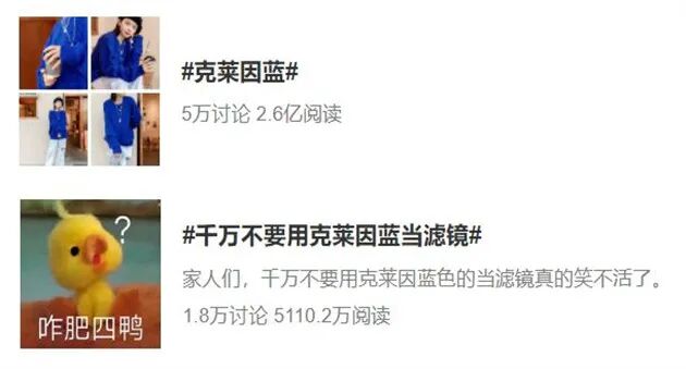 #克莱因蓝滤镜# #克莱因蓝显白# 微博上,克莱因蓝相关话题阅读量超3亿,讨论量达20万。