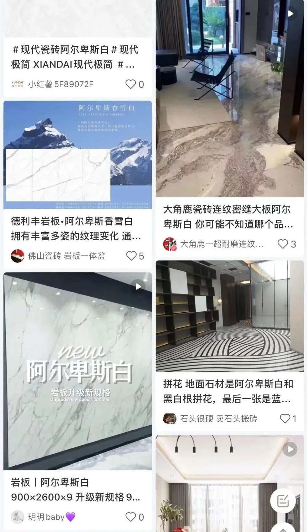 如家装圈最流行的阿尔卑斯白,材料虽然产自全年平均温度28度的佛山,但并不影响其如高山中的皑皑白雪、云间冰川般的寒意。尽管装出来还是轻奢北欧风,但一听名字就多了一丝中产追求的超凡脱俗的意境。