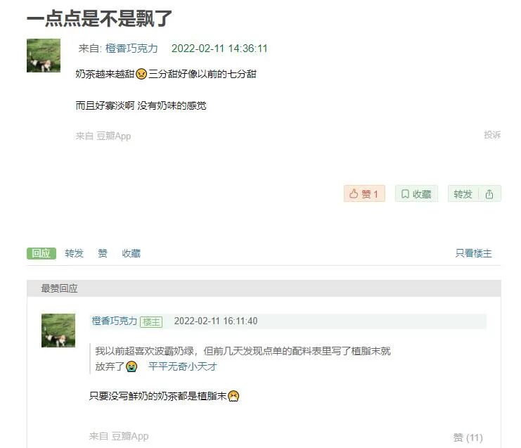 在拥有超过10万组员的“豆瓣奶茶小组”中,除了对口味的讨论之外,不少组员都把注意力放在了健康上。