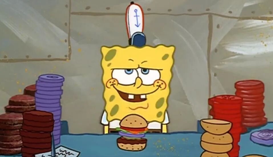 但另一部单枪匹马、纯靠咂摸味儿不靠梗的作品,或许才是当代打工人的心灵鸡汤——美国儿童动画《海绵宝宝》。