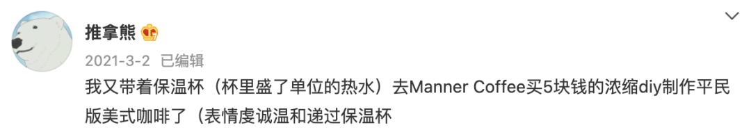 高性价比一直是Manner的标签之一。最会过日子的人,会带上自己的杯子点一杯10块钱的浓缩,兑上热水,实付5元,收获一杯蜜雪冰城同价美式。