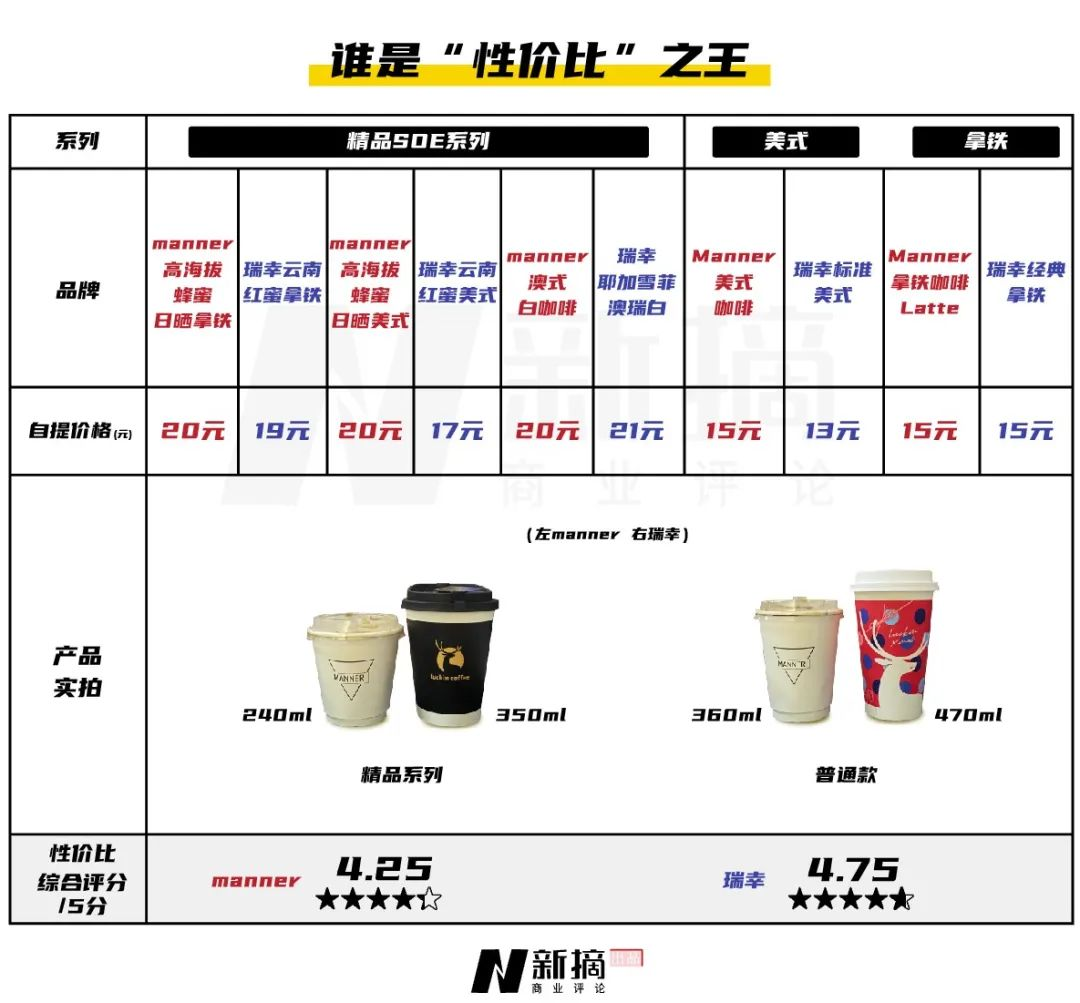 瑞幸除了一贯的优惠券大法,也早琢磨起了精品咖啡,再算上比Manner大一号的杯型,性价比总分更高。