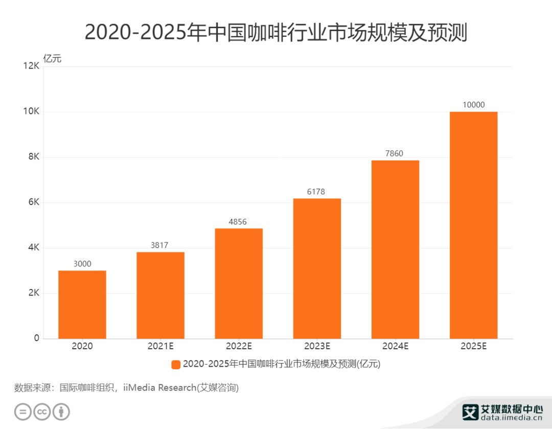2021年中国咖啡市场规模约3817亿元,2025年预计将迈入万亿市场(图片来源:艾媒咨询)