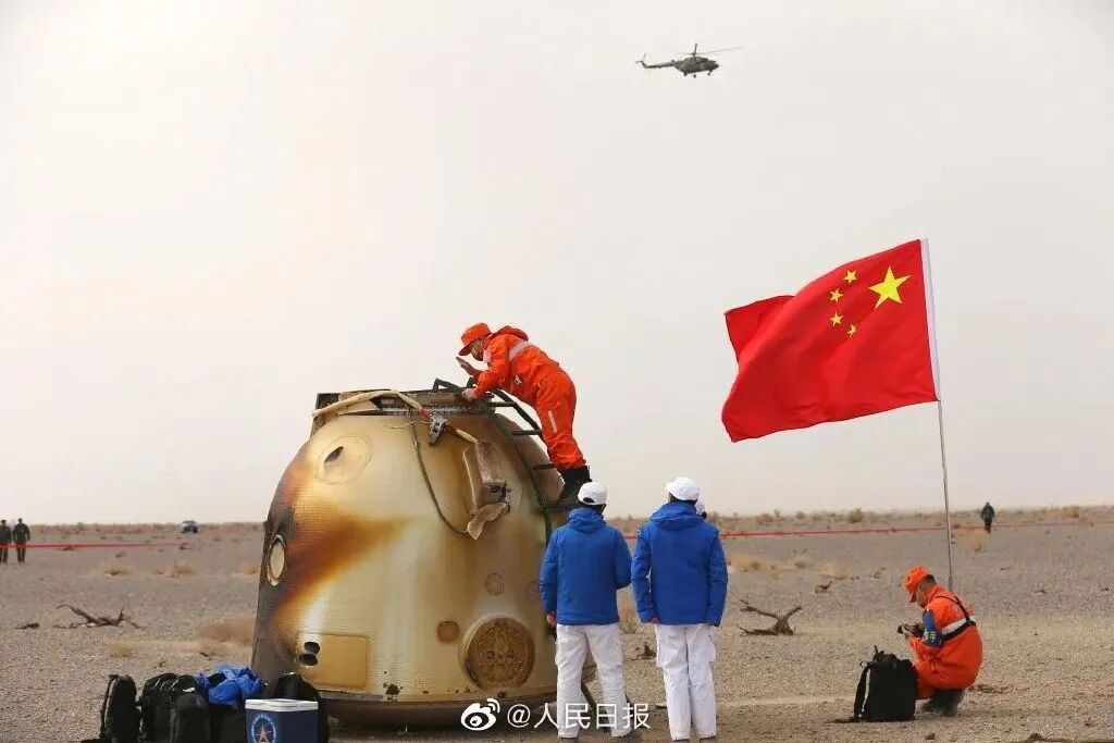“砰!”随着一声巨响,神舟十三号载人飞船返回舱在预定区域安全着陆,翟志刚、王亚平、叶光富三位航天员顺利返回地面。