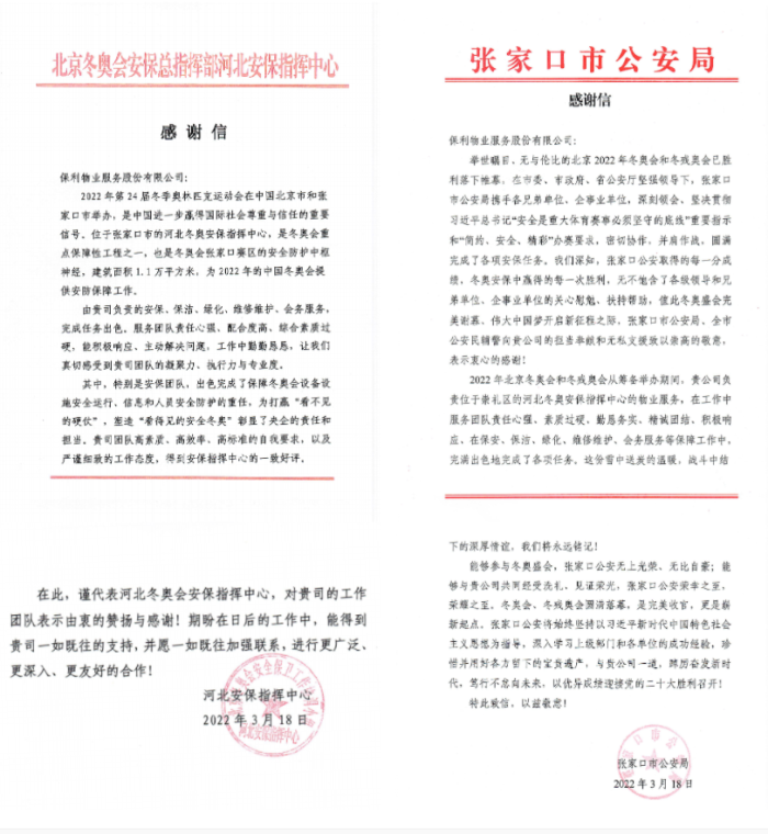3月底,保利发展控股旗下保利物业收到了两封来自张家口市公安局和北京冬奥会安保总指挥部河北安保指挥中心的感谢信。