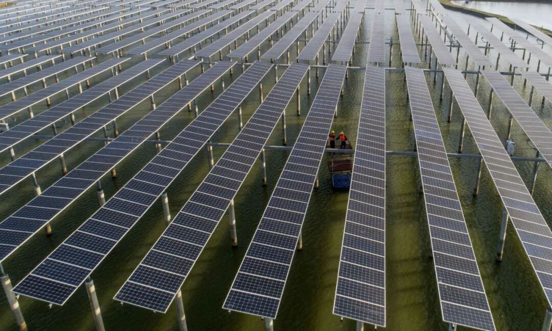 光伏板安装在鱼塘上,除了发电,还能养鱼。这种模式不占用土地,光伏板还能减少水面蒸发量、抑制藻类繁殖,鱼塘亩产达到750公斤。