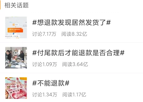 毫无意外地,买买买刚刚结束,#退款人#话题就被冲上热搜,参与话题的人非常之多,也足以说明退货群体的庞大。