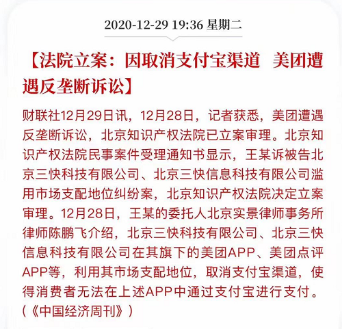 近两天,有报道称,美团因取消支付宝渠道遭到反垄断诉讼,目前已经被北京知识产权法院立案审理,成为继阿里之后,又一个遭到反垄断调查的互联网巨头。