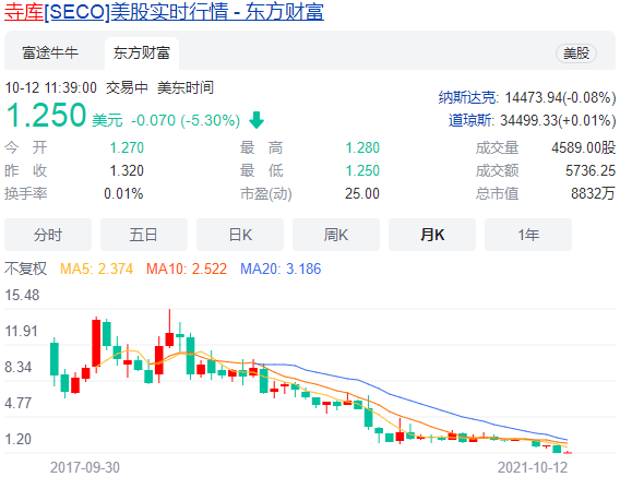 截止目前,寺库股价已经从最初13元的发行价下跌到1.25美元,总市值跌到不足1亿美元,跌幅达到了90%以上。
