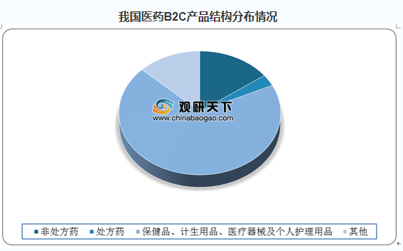 而B2C作为医药电商行业中最为活跃的市场,增速快,潜力大。在产品结构中,B2C市场分成非处方药品、处方药品、保健品和其他四大类。