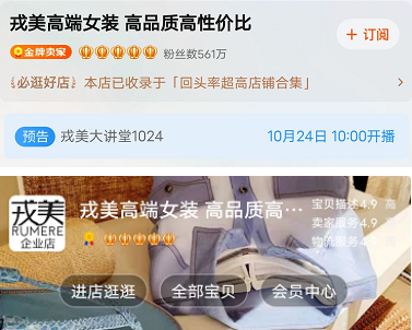 公司以“戎美高端女装”的淘宝店作为其主要的销售渠道,截止到去年底“戎美高端女装”在淘宝店铺的三个评分维度都接近满分,粉丝数量超过550万。