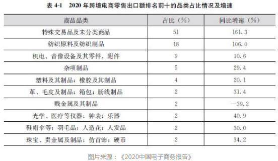 跨境电商进出口商品品类集中度较高,增速较快:从商品品类来看,2020年中跨境电商零售出口额排名前十的品类合计占比为97%,纺织原料及纺织制品、光学、医疗等仪器;钟表;乐器、革、毛皮及制品;箱包;肠线制品等实现快速增长,增速均超过30%。