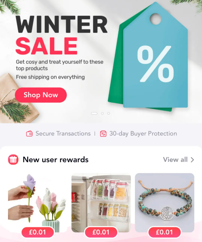 下载字节跳动的跨境电商软件Fanno之后,在首页最突出的位置就是新人折扣区。所有商品均定价0.01欧元,相当于拼多多最初的1分购。