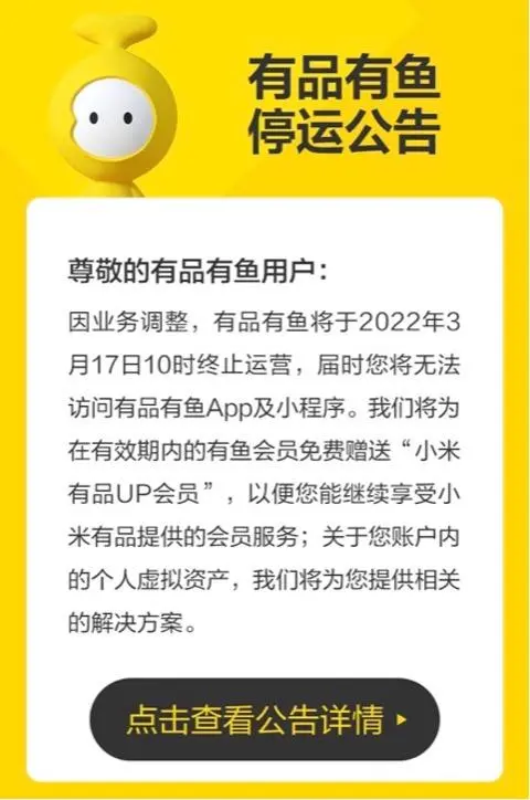 在发布的公告中显示,有品有鱼将会为有效期内的会员免费赠送小米有品UP会员,以便用户能够继续享受小米有品所提供的各项会员服务,关于用户账户内的虚拟资产也会提供相应的解决方案。