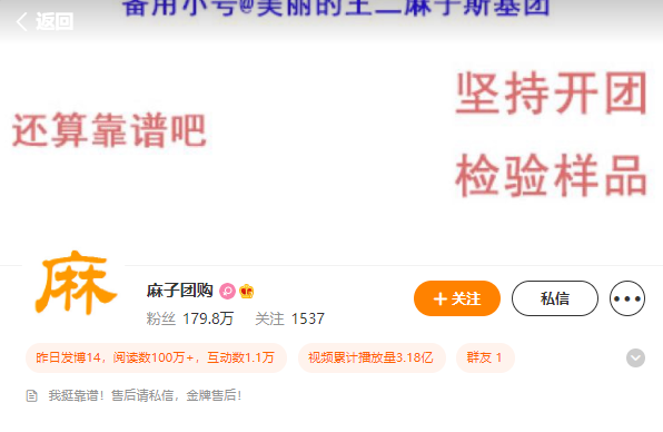 别看单条微博的转评赞数量并不是很高,就低估了团购博主的带货能力。例如微博粉丝数达到近180万的团购博主“麻子团购”,一天的微博能有上百万阅读数和1万以上互动数,加上微博粉丝群、微信粉丝群,能辐射到的粉丝绝对可观。
