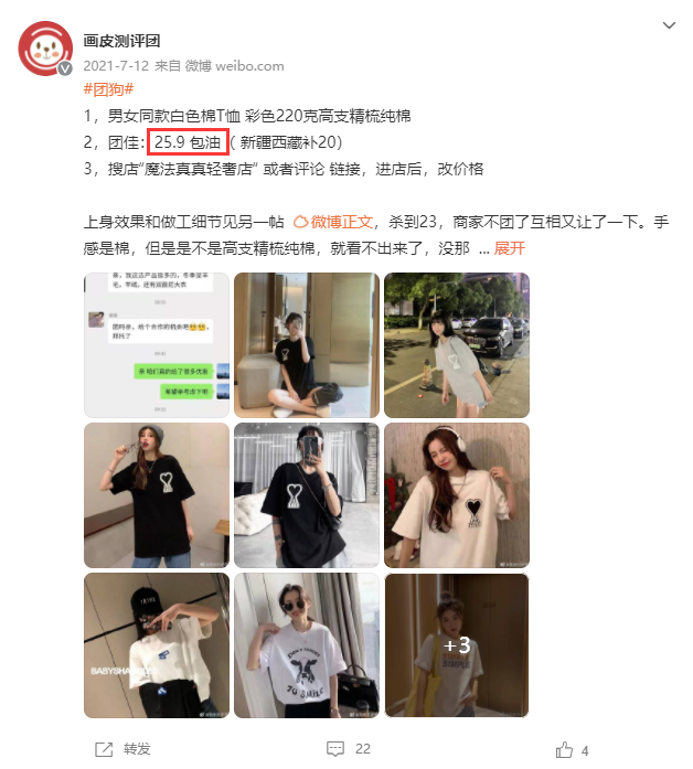团购博主深谙微博团购的套路和粉丝购买意愿的痛点——第一是强调便宜,毕竟参与团购的消费者本来就是奔着价格划算来的;第二要有美图,而且不能过度滤镜,要展示商品本身的真实情况;第三,推文的文案要让人有购买欲,比如包邮、返现之类的。