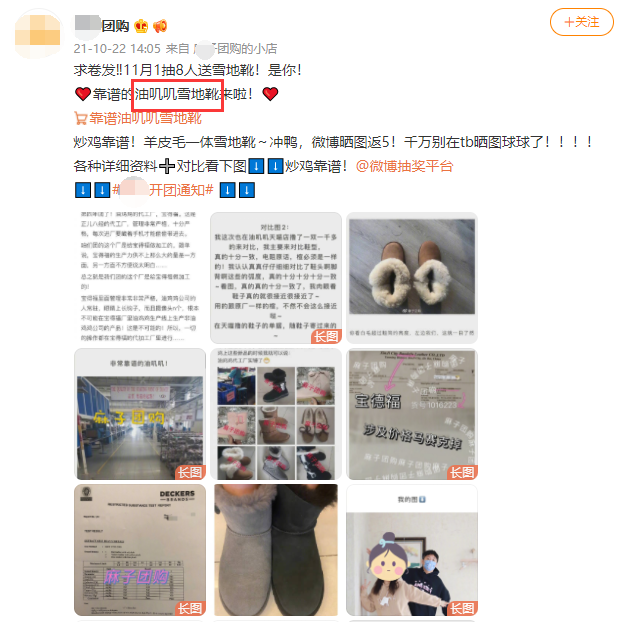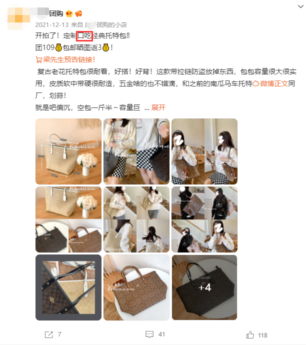 除了商品质量和价格问题,团购博主还面临着其他的风险。不少团购博主和仿品卖家合作,几百块就能图案到仿制的Dior托特包、Gucci小脏鞋,在推文中也会用别称来代指仿制的品牌,比如雕对应Dior、Coach是口吃、UGG油叽叽、加拿大鹅简称大鹅。