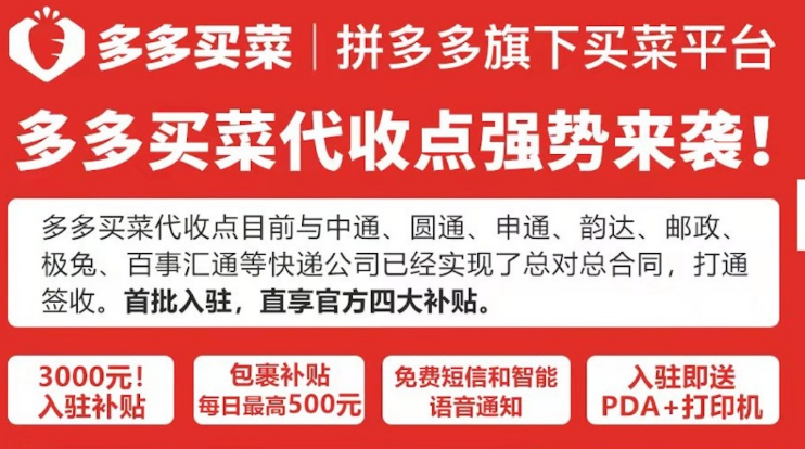 根据这次活动显示,首批使用多多买菜系统的代收点可享受四大补贴,包括3000元入驻补贴、包裹补贴每天最高500元、免费短信和智能语音通知、入驻即送PDA与打印机等。