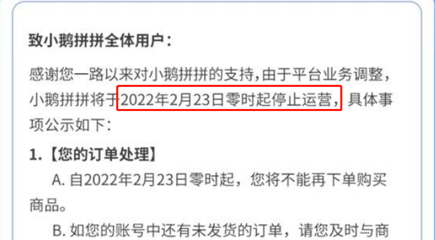一直到了2月22日,腾讯宣布,关停旗下的小鹅拼拼。