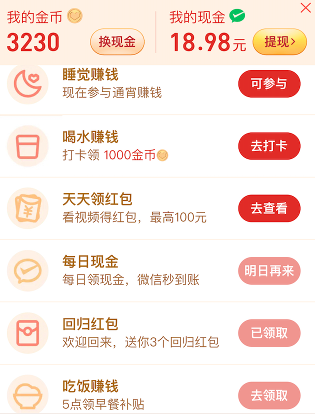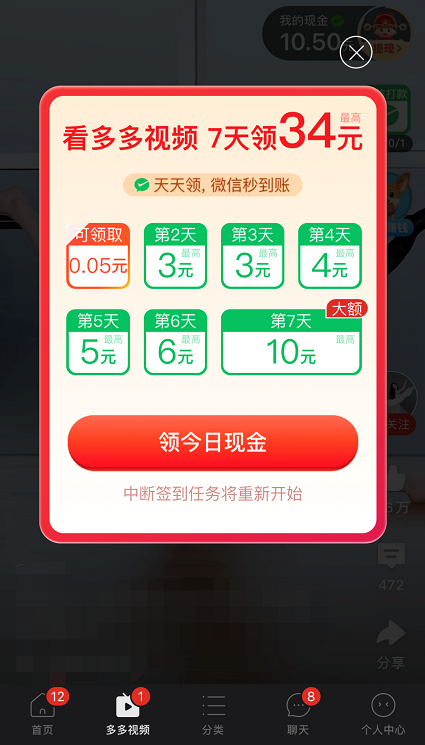 目前用户进入了多多视频,通过每日签到可以领取现金奖励、一段时间不观看视频回归之后也有现金红包、甚至在一日三餐及睡前也能够领取相应奖励。
